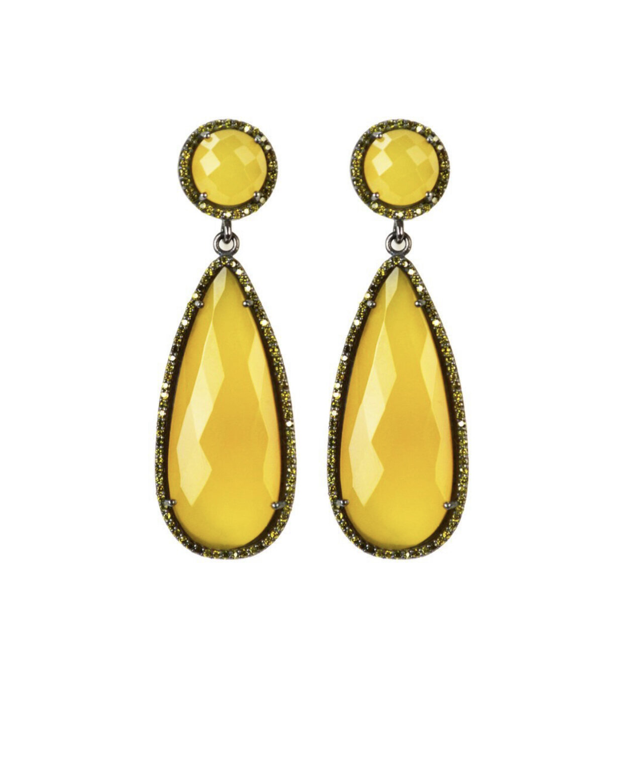 Yellow Chalcedony large drop earring finished in sterling silver and black rhodium, surrounded by Henna cubic zirconias pave stones.